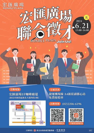 主旨:本處訂於113年6月21日(星期五)於新莊宏匯廣場一樓咖啡廊道舉辦「宏匯廣場聯合徵才活動」,請查照。